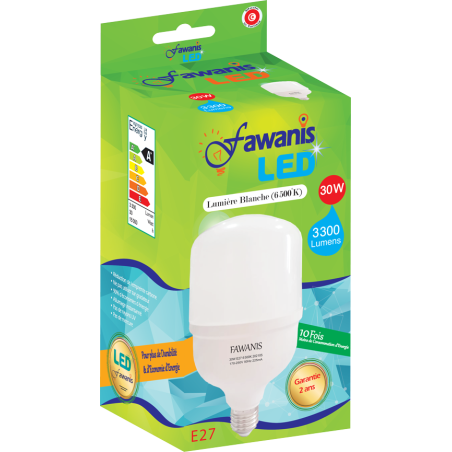 Lampe LED Fawanis 30W E27, lumière blanche froide 6500K, 3200 lumens, classe A+, idéale pour éclairage intérieur puissant.